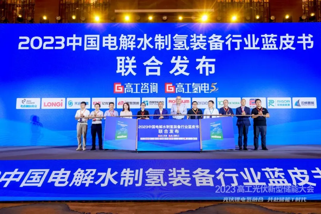 近日,由高工氢电产业研究所(以下简称GGII)主办的“2023高工光伏新型储能大会”在苏州隆重召开。会上,GGII联合隆基氢能等行业头部企业重磅发布了《2023中国电解水制氢装备行业蓝皮书》(以下简称蓝皮书)。蓝皮书重点推荐了隆基氢能参与的中国石化首个万吨级绿氢示范项目和吉林大安风光制绿氢合成氨一体化示范项目,展示了隆基氢能优异的产品技术水平与交付能力,为氢能产业发展提供了重要的示范意义。