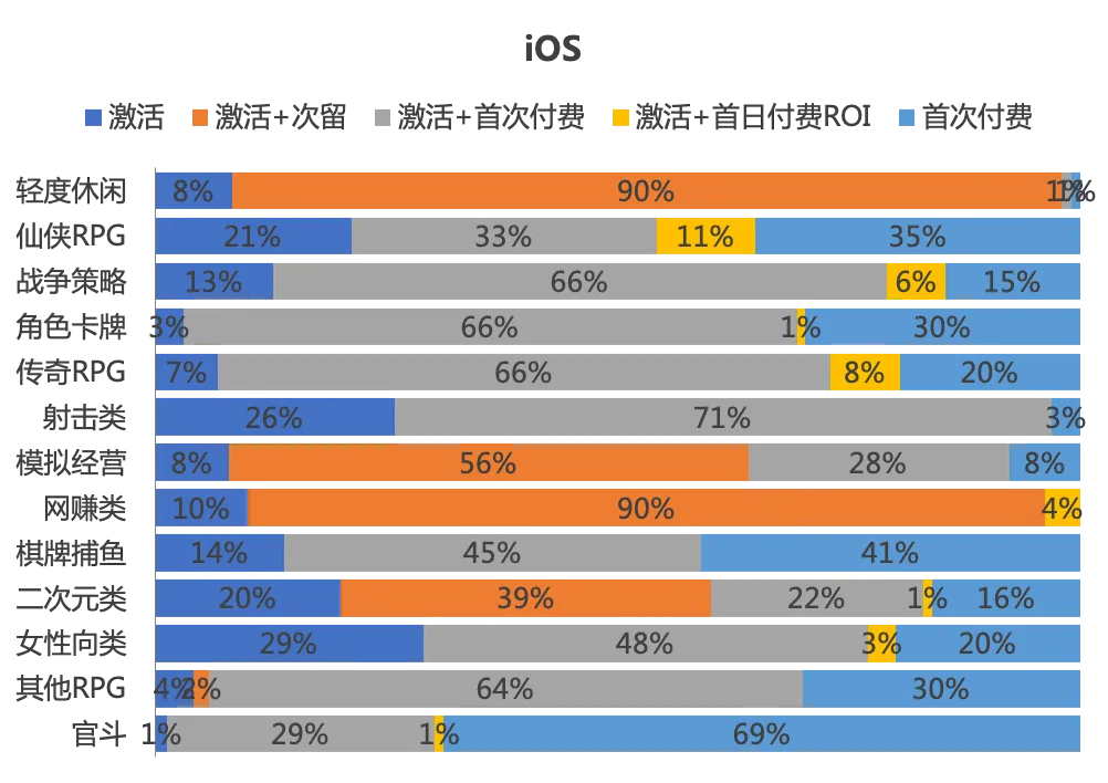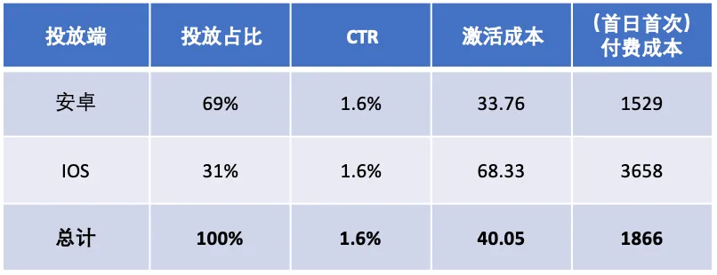 投放占比:较上月安卓下降4%,IOS上涨4%,主要由于射击类新游加入放量投放; 激活成本:安卓无明显变化;iOS下降21%,主要由于轻度休闲类增投,成本同步下降。 付费成本:双端获取用户的首次付费成本无明显变化。