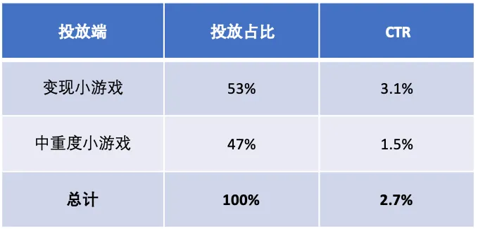 投放占比:较上月持平。 CTR:变现小游戏玩法较轻度,素材多且内容较丰富,CTR普遍高于中重度小游戏,中重度小游戏仍将持续探索和沉淀优质创意方向。