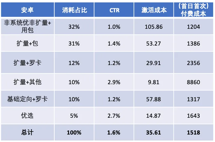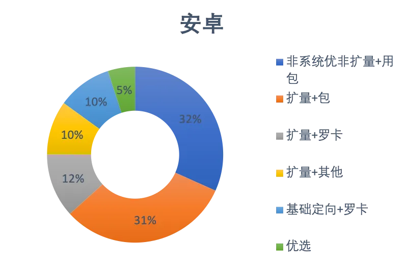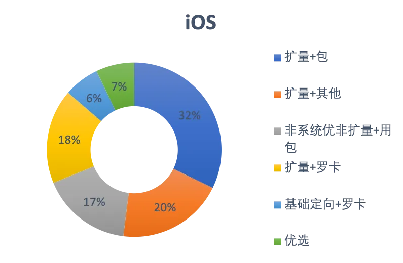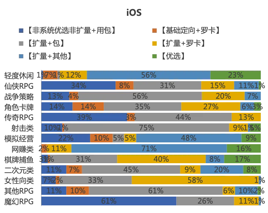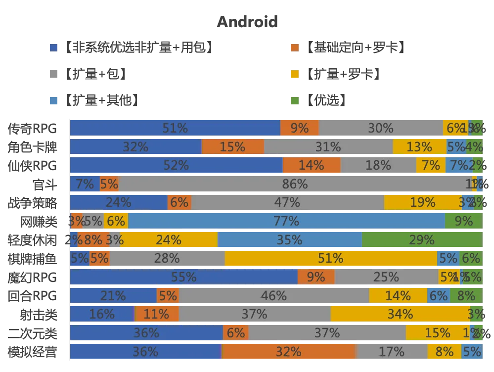 双端定向分布来看, 轻度游戏(轻度休闲+网赚+iOS模拟经营)更愿使用【扩量+其他】(如扩量+基础定向),扩量比例为行业最高为76%-94%;主要因为品类受众用户广泛,广告主愿意在定向环节,尝试扩大范围来寻找潜在转化用户; 传奇/仙侠/魔幻/官斗/卡牌等中重度使用【非系统优选非扩量+用包】和【扩量+包】占比大,强依赖人群包,操作相对保守,建议:1. 借鉴棋牌捕鱼/女性向类,提炼和迭代多维度的关键词进行投放, 使用【扩量+罗卡】;2. 应用一方优质人群 & DMP标签广场挖掘优质二方包,使用【扩量+包】