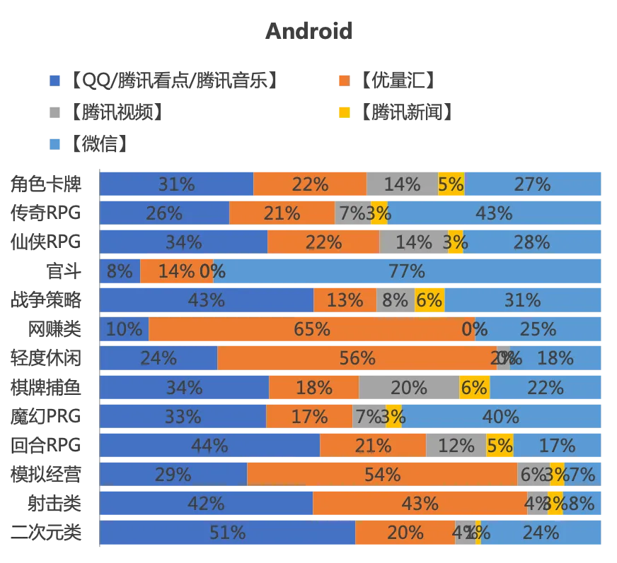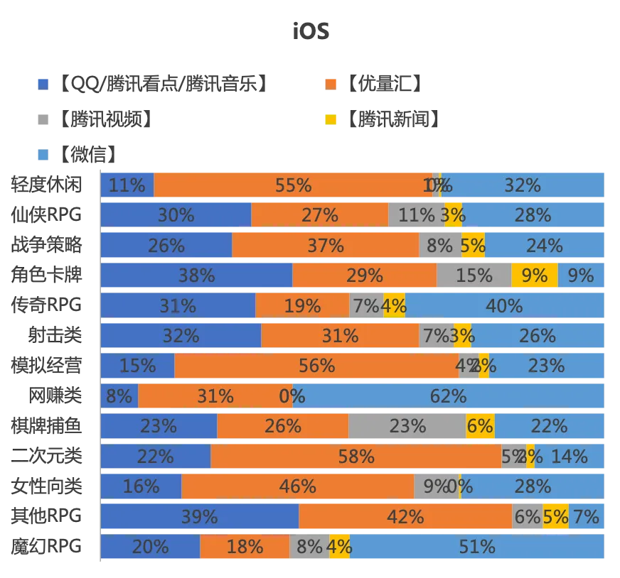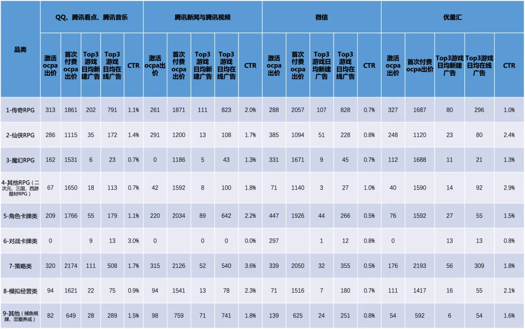 安卓:较上月魔幻RPG增投明显,传奇RPG和魔幻RPG在微信流量投放占比上升,因微信获取高价值用户好,客户增投。 轻度休闲类和中重度游戏依旧在优量汇投放占比大,优量汇获取用户“激活成本以及付费成本”相对低,有相对机会获取高价值用户。 iOS:较上月射击类增投明显,与新游上线有关。轻度休闲类(网赚类+轻度休闲)及中重度热门品类(传奇+仙侠+战争策略+射击类)在微信和QQ/腾讯看点/腾讯音乐流量上投放占比大,主要因更易获取高价值用户。