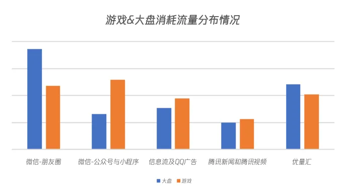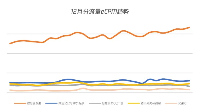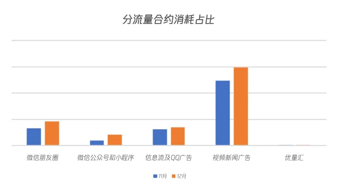 大盘合约消耗占比提升36%,挤占竞价可用流量 对比11月份,12月大盘合约消耗占比提升36%,其中腾讯视频和微信朋友圈提升的绝对值最高 12月大盘竞价ecpm提升约5%,竞争环境逐渐激烈化 从月初到月底,微信朋友圈竞价ecpm提升27%,优量汇竞价ecpm提升11% 游戏行业大盘消耗占比提升4% 主要的竞争行业为教育和网服行业 游戏行业消耗分布结构对比大盘,朋友圈和优量汇消耗占比不足,其余流量存在优势: 朋友圈消耗占比较大盘低37%,优量汇消耗占比较大盘低16%