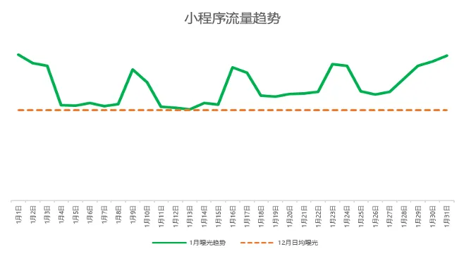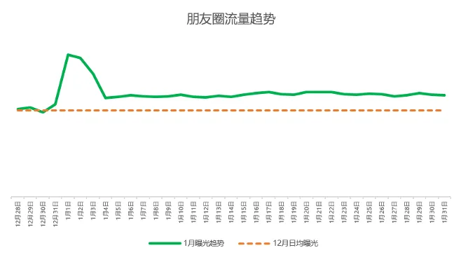 流量机会: 1月增长呈明显节假日效应,朋友圈和小程序流量在元旦及寒假期间,有明显增长,特别受寒假DAU增长影响,广告主可重点把握流量高峰期。