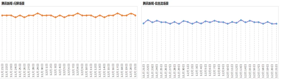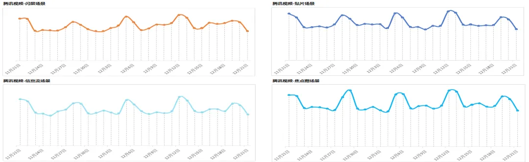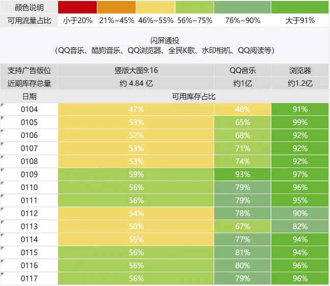 腾讯看点(QQ看点、QQ浏览器、看点快报) 流量机会:周末曝光上涨5%-10%,寒假开始后将持续维持高位;合约锁量<30%,暂无大订单,库存充足; QQ及其他(QQ空间、QQ消息、QQ小程序/小游戏) 整体库存平稳,周末效应明显,比工作日增长10%;合约锁量<10%,暂无较大订单,库存充裕。教育行业寒假课程持续抢量(尤其是周末,会持续到1月中旬,广告主需重点关注在周末适当提价抢量。