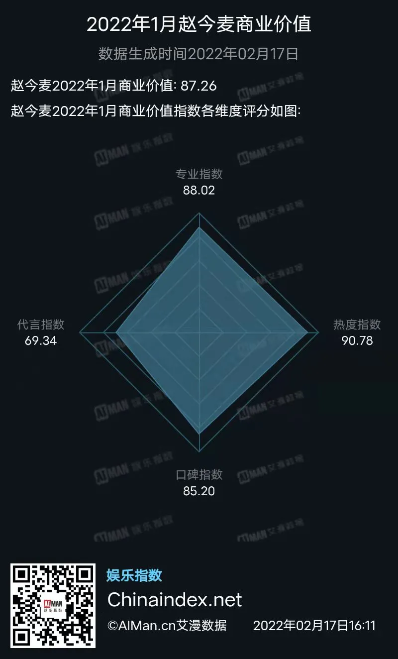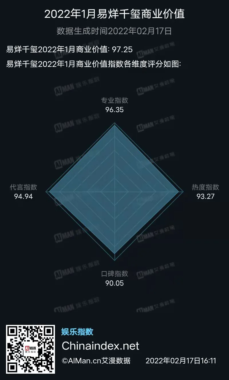 同时,易烊千玺还在1月连续拿下元气森林气泡水代言人和阿玛尼美妆全球品牌代言人两大代言,代言指数也有上涨。因此,易烊千玺在2022年1月商业价值表现十分优异。
