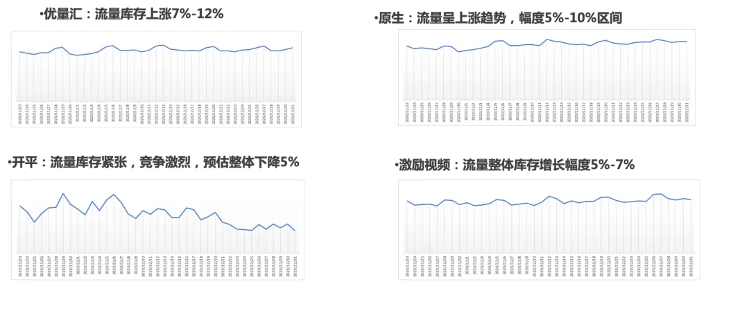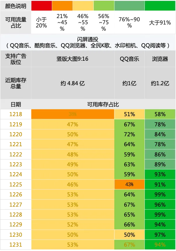 12月中下旬假期带动、库存小幅度提升;合约锁量极少,竞价库存高于全年均值,可增加广告数及账户数抢量。•预计增涨2%-5%, 合约锁量:<20%,库存充足QQ及其他(QQ空间、QQ消息、QQ小程序/小游戏)•合约锁量:<10%,未来暂无较大订单,竞价库存充裕·流量机会:早午晚高峰(6-10点、11-13点、20-24点)整体保持平稳,12月下旬期间,预计闪屏场景竞争环境上涨5%,建议游戏广告圣诞节期间可适当提价.·流量机会:早午晚高峰(6-10点、11-13点、20-24点)库存趋势:流量上涨,集中在12月中下旬,主要源于阅读类及手游类媒体流量的增长。·流量机会:早午晚高峰(7-8点、12-14点、20-23点),晚间为全流量峰值,周五高峰起可考虑适当提价