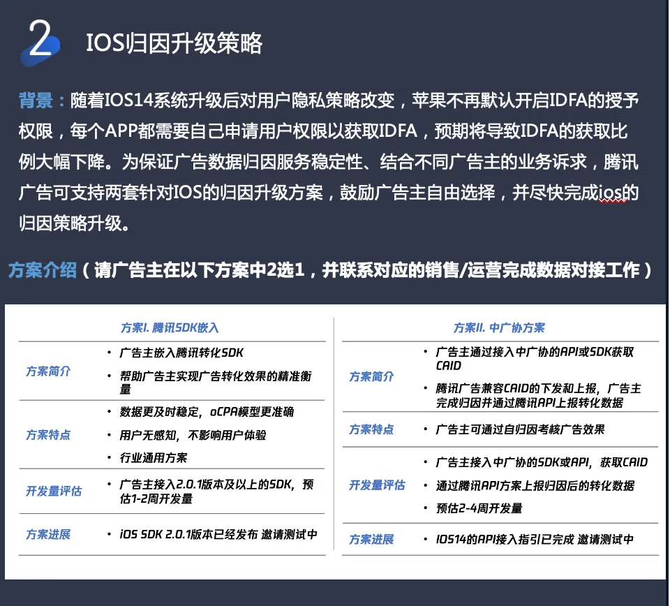 ·朋友圈支持“引用外层素材” 组件运用多创意形式,提效广告创建升级前:针对多个朋友圈创意形式,每个创意形式都要创建1个尺寸类型相同的顶部素材原生页,投放多个朋友圈创意形式需要准备多个原生页升级后:任意的朋友圈创意形式,均可使用同1个「引用外层素材」的原生页,使用1个原生页即可投放所有朋友圈创意形式ADQ端 创建原生页时,顶部组件新增「引用外层素材」组件,不用指定顶部组件内容,直接提交创建原生页ADQ端 投放朋友圈广告时,填写广告外层素材,并可筛选和使用该类型「引用外层素材」原生页朋友圈广告实际曝光时,原生页顶部「引用外层素材」组件,将拉取广告外层素材播放·系统新增预估转化效果功能,帮助客户快速判断真实成本·曝光&点击后的激活、付费行为产生滞后,当天的点击可能在之后的N天内产生激活/付费行为·因此当天看实时成本会虚高,几天后转化逐渐发生&回流,回看数据成本下降小张:如果系统能够帮助我预估当天广告曝光能带来的总转化数和转化成本,这种情况就不会发生了https://developers.e.qq.com/docs/api/tools/estimation/report_conversions_predict?version=1.1&_preview=1·转化归因支持授权&IOS归因策略升级,助力高效接入投放