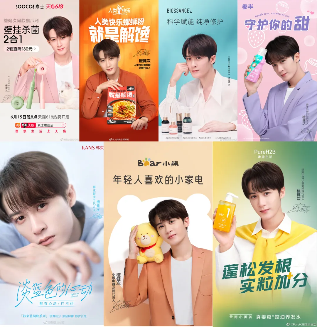 5月,檀健次的代言收获颇丰,仅商业代言就有:素士电动牙刷代言人,人类快乐螺蛳粉品牌代言人,BIOSSANCE精华代言人,参半品牌口腔代言人,美妆品牌韩束新实力代言人,小熊电器品牌代言人,个护品牌津梁生活小黄姜品牌代言人。