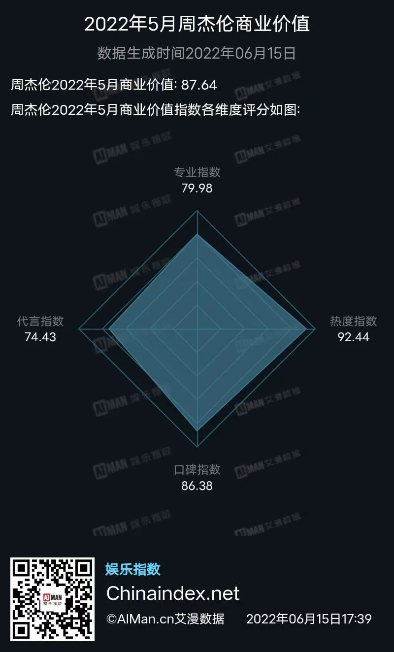 5月,还有多位老牌艺人商业价值成绩值得一提。除了“健身博主”刘畊宏继续在5月保持着出色表现以外,好友周杰伦在5月20日和5月21日分别将《地表最强》和《摩天伦》两场演唱会线上重映,也引发不少歌迷一波“回忆杀”。一时间周杰伦的热度指数提升,带动商业价值蹿升。