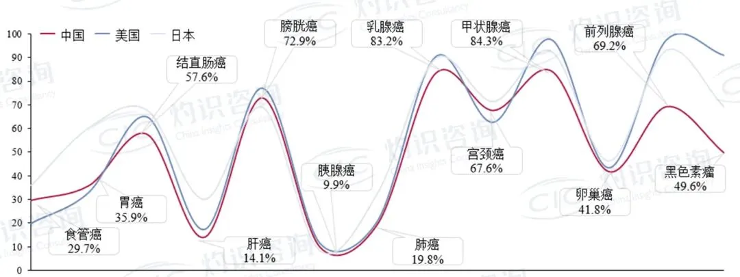 从肿瘤负担来看,随着中国人口老龄化、社会生活环境和生活方式的变化,癌症已逐渐成为中国居民死亡的重要原因。《柳叶刀》发布的《1990-2017年中国及其各省死亡率、发病率和危险因素》研究报告显示,1990年没有任何一种癌症跻身中国居民的前十大死亡原因,而在2017年的前十大死亡原因中,不同类型的癌症已占据三项,其中肺癌因于每十万人中造成1,065人的死亡居于第三位 。2018年《柳叶刀》全球癌症生存趋势监测报告(CONCORD-3)显示,我国癌症整体五年生存率为36%,远低于美国(64%)和日本(57%)①。资料来源:柳叶刀;美国癌症协会;日本国立癌症研究中心;CIC灼识咨询1