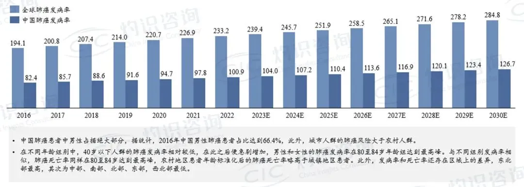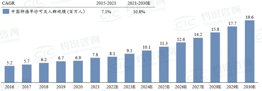 液体活检已成为当前肺癌早诊最前沿的研究方向,并且,2023年3月,国际上首个系统阐述肿瘤液体活检技术在临床应用的指南《中国肿瘤整合诊治技术指南(CACA)-液体活检》发布。液体活检技术具有克服肿瘤异质性、可多次取样、动态实时检测、微创或无创、高灵敏度和特异性的特点。该指南整合了现有多种肿瘤指南共识及经验总结,兼顾中国特色及原创性研究,旨在推动液体活检技术的研究、开发及规范应用,为液体活检技术在肿瘤早筛早诊、伴随诊断、预后评估、疗效监测、耐药评估、用药指导及术后复发转移风险评估的规范化应用提供指导。常见的液体活检检测标志物包括 循环染色体异常细胞CAC(Circulating genetically abnormal cells),循环肿瘤DNA(Circulating tumor DNA),外泌体及miRNA等。CAC作为肿瘤原发灶或转移灶进入外周血的完整细胞,具有完整的细胞形态及种系多样性,是肿瘤转移的重要途径,并可提供单细胞层面上的完整染色体变化,核酸分子特征,蛋白表达差异。ctDNA可以检测的靶点包括ctDNA甲基化、拷贝数变异及基因突变,可帮助肿瘤分型和实时监测耐药突变。根据最新发布的《早期肺癌诊断专家共识(2023年版)》,推荐年龄40岁至80岁的人群中开展肺癌筛查,对于具有肺癌危险因素的更年轻个体,根据临床实际情况和个体意愿确定是否行肺癌筛查。推荐采取的影像学检查手段为胸部低剂量CT(LDCT)。根据《健康中国行动(2019-2030年)癌症防治行动》,到2022年,重点癌种的早诊率需达到55%及以上,且基本实现癌症高危人群定期参加防癌体检。针对肺癌,由于LDCT依从率较高,早诊率提升较为乐观,预计2030年肺癌LDCT渗透率可以达到60%。据测算,2021年中国肺癌早诊可及人群达780万人,相较2015年的520万人复合增速约7.1%。随着中国人口结构的日益老龄化,预计未来十年中国肺癌早诊可及人群规模将以10.8%的复合增速进一步于2025年、2030年分别增长至1,130万人、1,960万人。参考资料:① Allemani, C., Matsuda, T., Di Carlo, V., Harewood, R., Matz, M., & Nikšić, M. et al. (2018). Global surveillance of trends in cancer survival 2000–14 (CONCORD-3): analysis of individual records for 37 513 025 patients diagnosed with one of 18 cancers from 322 population-based registries in 71 countries. The Lancet, 391(10125), 1023-1075.