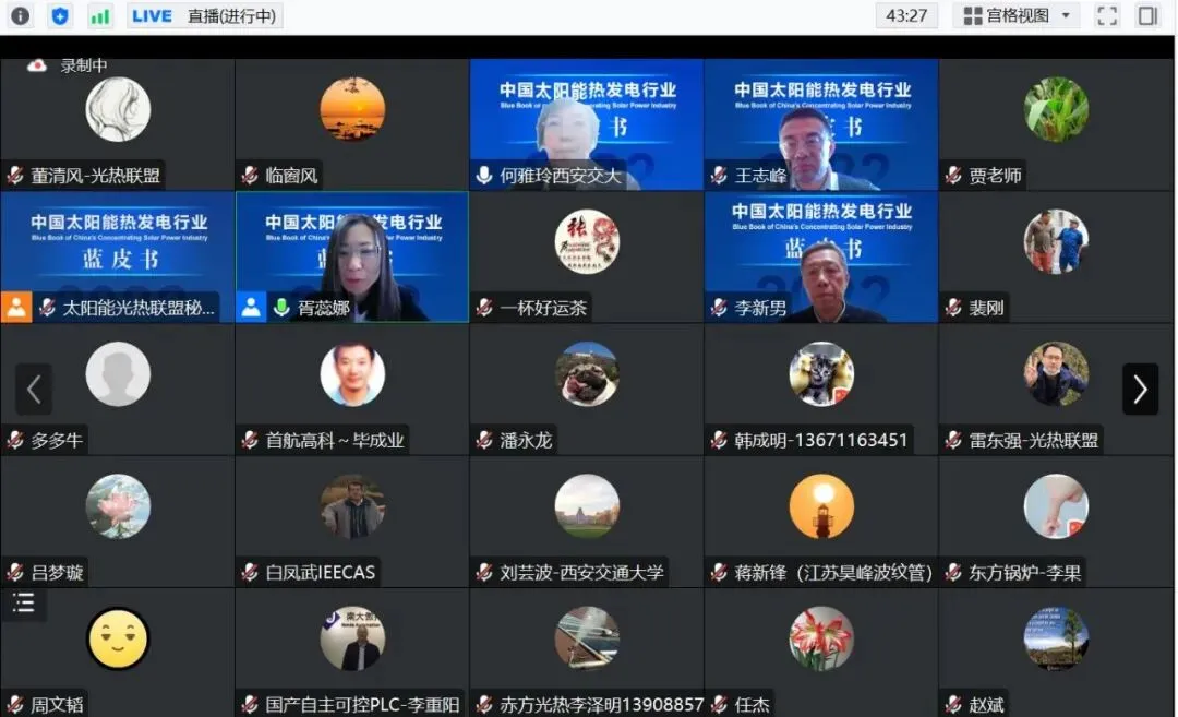 部分线上参会代表《蓝皮书》由国家太阳能光热产业技术创新战略联盟(以下简称:国家光热联盟)和中国可再生能源学会太阳能热发电专委会(以下简称:热发电专委会)联合编写,由国家光热联盟专家委员会审核,经国家光热联盟专家委员会主任委员何雅玲院士批准发布。发布会由中组部“万人计划”青年拔尖人才、教育部“长江学者奖励计划”青年学者、热发电专委会副主任委员、清华大学能源与动力工程系胥蕊娜教授主持。来自国家光热联盟理事长联席会、专家委员会,热发电专委会的领导和业界代表、主流媒体在线参会。