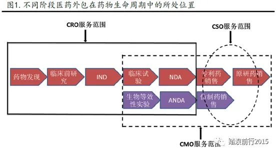 目前现状是CMO与CRO现在都是交叉延伸,挤占彼此领域,好在当下是行业景气周期,大家都能喝点汤,往长远看,提出一个问题,CRO往CMO延伸容易,还是CMO往CRO延伸容易呢?个人一点不成熟的想法,可能处于药物生命周期前面的可能会更有优势,比如药物发现阶段的药明康德、康龙化成,主要的就是现在的业务可以给未来领域延伸,做引流啊,某种意义上说卡住了关键位置。先看下图