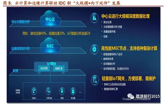 5G时代,云计算和边缘计算协同互补,共促IDC行业发展,5G时代到来以后,云计算会从整体上进行把握。中心云主要负责大规模深度数据处理,边缘计算主要是专注于局部,对实时数据进行处理。从整个行业的发展变革来看,云计算和边缘计算驱动IDC行业朝着“大规模、超大规模+小型化、微型化”两大方向发展。