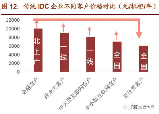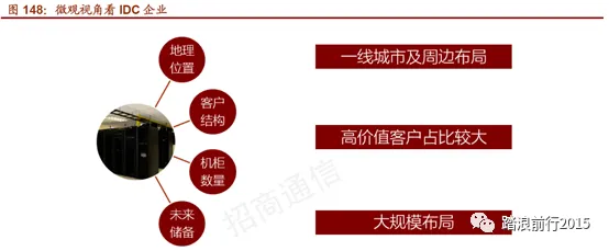从微观视角来看传统IDC 企业,对于传统IDC 企业而言, 地理位置、客户结构、机柜数量和未来储备是关键竞争要素,由于传统IDC 企业的高价值客户主要分布在一线城市,所以在一线城市及周边进行大规模布局,抢占高价值客户,能显著提高机柜出租率及改善客户结构,提升ARPU 值和收入规模。