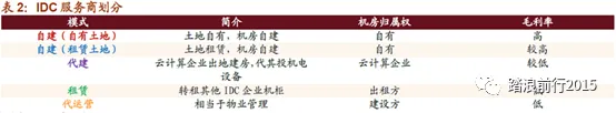国内IDC服务商,根据模式不同,体现为毛利率不同,IDC企业建设模式,目前市场上存在五种较为常见的模式,其中,自建模式盈利能力较强。每年平均机柜租金在8万元左右。