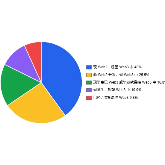 最大的一块是仍在 Web2 或校园、但持续观望 Web3 的人,接近一半; 其次是一批已经在 Web3 全职或长期投入的开发者; 还有一个小但重要的群体:已经或准备退坑 Web3 的人。
