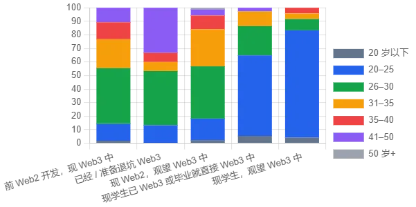 学生和应届生比例略高,说明新一代开发者更早把 Web3 视为职业选择之一; 样本中 35 岁以上的资深工程师也占有一定比例,其中既有人正在尝试,也有人已经退场,对趋势的判断往往更为冷静。