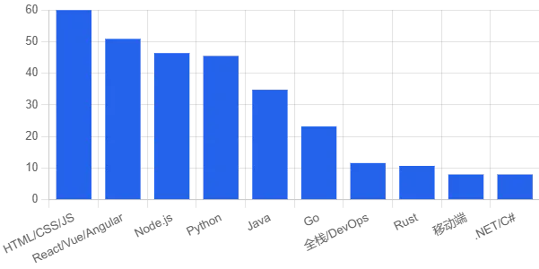 前端 + 全栈 JS 是绝对主力,为 DApp、钱包和控制台提供基础。 Python、Java、Go 构成后端阵营,支撑交易、数据和基础设施。 Rust 和少量 C/C++ 集中在高性能和底层协议开发中。