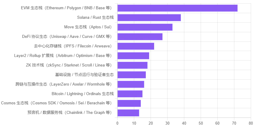 少数受访者在开放题中直接填写了「Solidity」等关键词,我们在分析时也统一归入对应的 EVM 生态栈。因此,你在图表中看到的是「EVM / Move / Solana / ZK 等生态栈」,而不是单独的「Solidity」选项——这并不代表大家不用 Solidity,而是出于统计口径的选择。