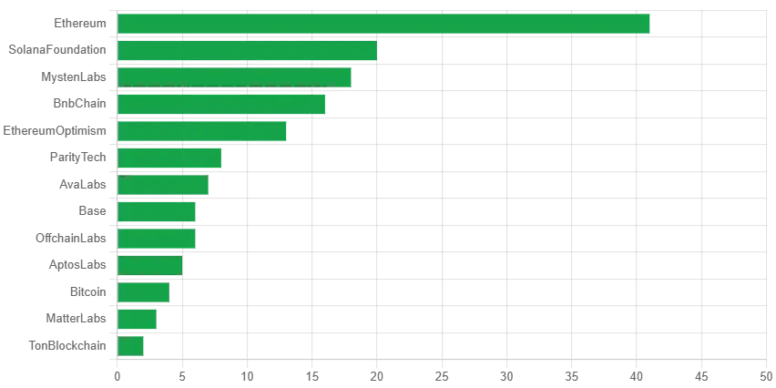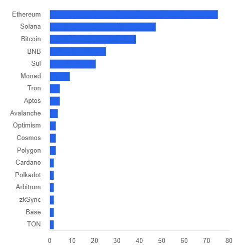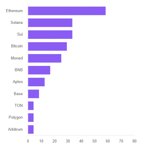以 Ethereum 为中心的格局,在华语样本中与全球数据高度一致:它几乎是所有开发者进入 Web3 的「默认选项」。Solana 与 Bitcoin 构成明显的第二梯队,BNB、Sui、各种 L2 和新公链紧随其后。