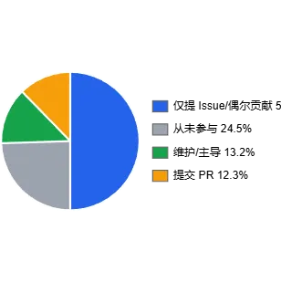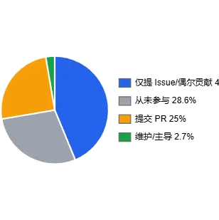 参与方式上,提 Issue 最常见,写 PR 的人明显减少,长期维护项目的核心贡献者更少。