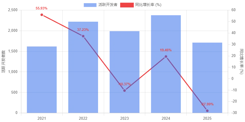 图 34:2021–2025 年华语开发者贡献活跃度(柱状图:活跃开发者数,折线图:同比增长率)。