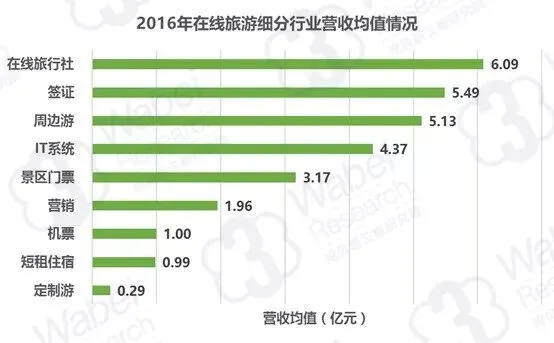 从细分行业看,2016年在线旅行社的营收均值排在首位,达到6.09亿元;其次是签证5.49亿元以及周边游5.13亿元;IT系统、景区门票、营销服务及机票的营收均值都在1-5亿元,1亿元以下的是短租住宿和定制游,这可能是由于短租住宿和定制游属于新兴、小众的市场,面向的主要是中高端消费群体,尽管客单价高,但是成交量相对比较低,因而整体营收规模较小。