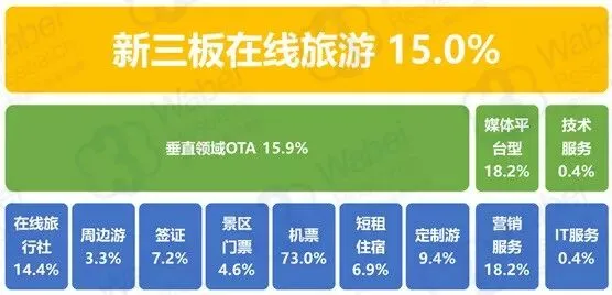 数据显示,新三板在线旅游行业毛利率均值为15.0%,在互联网行业中处于较低水平。此外,在线旅游各细分行业毛利率也有很大差异,排在前三位的分别是机票73.0%、营销服务18.2%、在线旅行社14.4%,而排在末位的IT服务仅为0.4%。