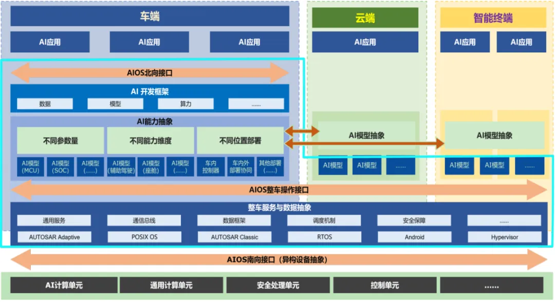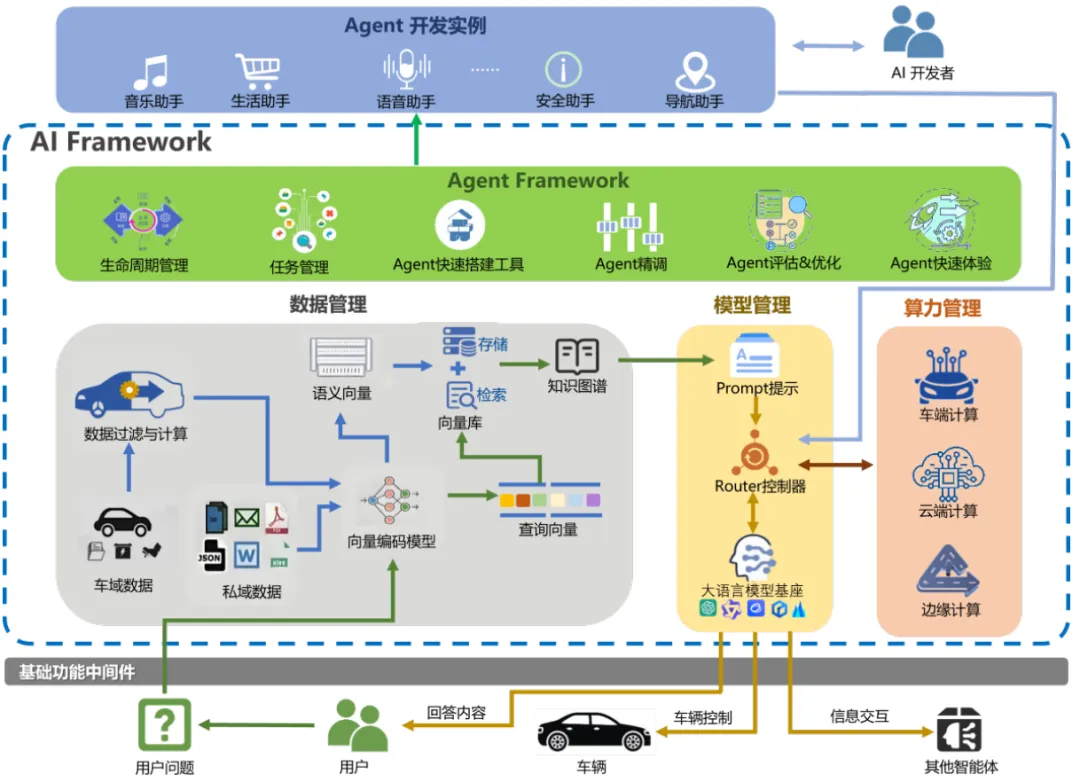 整车 AIOS架构由三个部分组成,分别是车端、云端和智能终端。各部分主要都分为异构设备抽象层、基础功能层(整车服务与数据抽象层)、AI能力抽象 / 模型抽象层、AI开发框架层(车端独有)、AI应用层。1) 提供全链路开发工具链,实现车端能力的渐进式AI化重构;2) 信号转换为原子服务:将CAN/LIN等总线信号自动封装为可复用的原子服务;3) 原子服务封装为组合服务:通过可视化编排引擎,将原子服务组合为场景化功能;4) 组合服务转型为智能服务:注入AI上下文,生成支持智能体调用的MCP/RESTful接口,形成 “车辆能力 - 智能服务” 的映射库;5) AI赋能智慧化自动配置:将软件开发方法学输入AI模型,构建AI赋能的自动配置工具,代替繁重的人工配置和检验逻辑。AI能力抽象层通过编程语言融合、 服务智能化及全链路工具链,构建了【信号→服务→智能接口】的转化体系,以及AI赋能的智慧化配置工具。这不仅消除了传统车载开发与AI开发生态的技术壁垒,更确立了以智能服务为中心的新开发范式,为车载AI应用的规模化落地奠定坚实基础。AI开发框架层(AI Framework),其核心功能是AI能力的集成与管理,包含数据管理、模型管理、算力管理三大核心组件,以及Agent Framework开发框架;这些组件共同为AI应用的开发集成与运行维护提供基础支持。1) 数据管理模块:处理用户指令与车辆数据,经分析提取价值信息、向量编码生成语义向量,按要求存储加密构建数据库;用户操作时快速检索生成知识图谱并转prompt给LLM,提升个性化服务能力。2) 模型管理模块:针对LLM云端为主、车端小模型探索且架构多样的情况,依托Model router提供统一接口方便切换模型,还能凭评测知识按任务分配给适配LLM,提高处理效率与准确性。3) 算力管理模块:modelrouter选模型时考虑车辆算力,选定后该模块按模型参数与车端资源动态分配,如座舱算力不足时调用空闲智驾芯片处理高隐私复杂任务。4) 低代码开发平台:低代码环境,内置任务管理等组件,降开发门槛、提效率,方便快速开发部署agent,无需高专业能力,加速AI落地与生态构建。