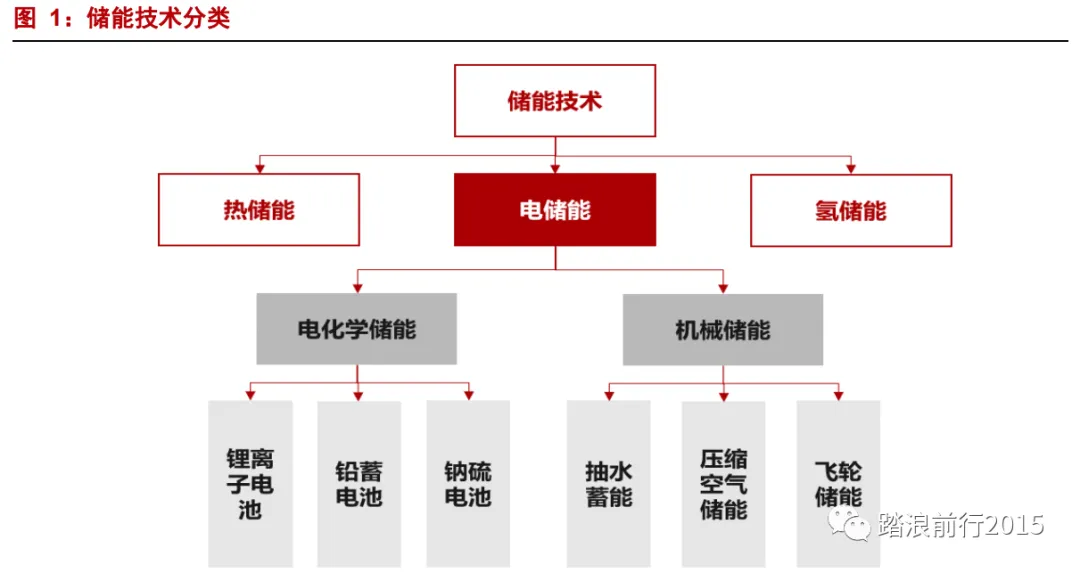 目前,储能技术主要分为电化学储能和机械储能两大流派。根据正负极材质的不同,电化学储能分为锂离子电池、铅蓄电池与纳硫电池。机械储能根据储能方式,分为抽水蓄能、压缩空气储能与飞轮储能,当前储能市场重点发展和增速较快在电化学储能方向。