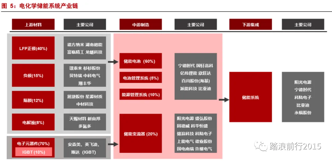 电池模组的上游是锂电材料,PCS 与 BMS 上游主要包括功率半导体和各类芯片。电化学储能产业链中,电池与逆变器环节具备较高的投资价值。就价值量而言,电池占比分别60%,逆变器占比20%。