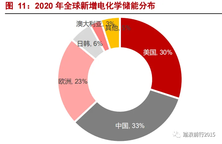 从国内外发展趋势来说,中国、欧美及日韩是主要应用储能的国家。2020 年新增装机中,中国、美及欧洲分别贡献 33%、30%和 23%,合计占比 86%,是储能系统规模化应用的主要推动者。