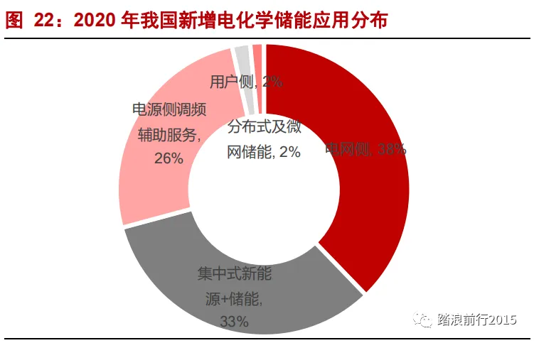从电力系统角度来说,电化学储能应用场景有发电侧、输配电侧与用户侧,其中,发电侧与输配电储能装机相对较大,归为集中式储能,用户侧一般为户用和工商业储能,装机相对较小。