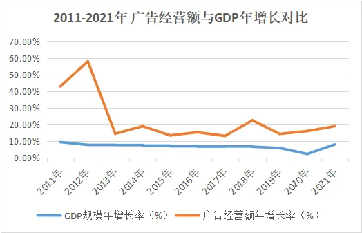 ▲ 数据来源:GDP规模年增长率来源于世界银行,广告经营额来自原国家工商总局、市场监管总局