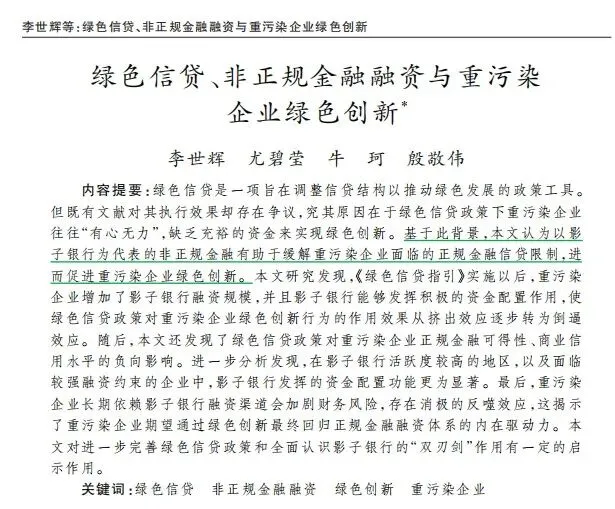 在绿色创新研究领域,2012年出台的《绿色信贷指引》是一项非常重要的政策,但此政策的空间似乎已经被挖完了。没想到,最新一期的经济研究,又发了一篇高质量文章:李世辉等老师的《绿色信贷、非正规金融融资与重污染