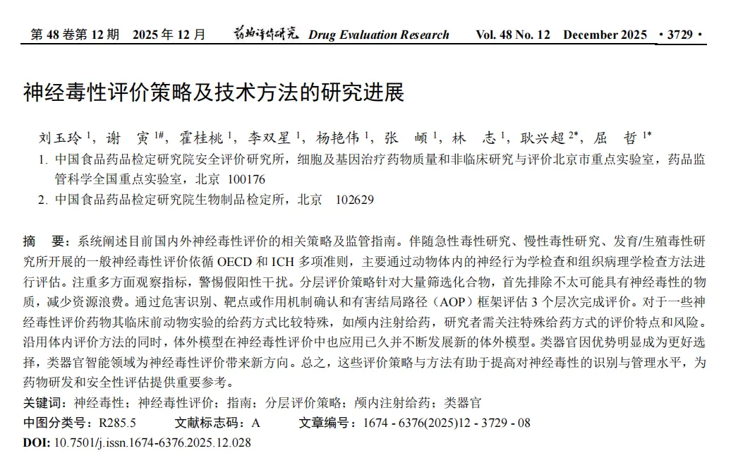综上所述,神经毒性评价是确保化学品安全性的关键环节。通过遵循一般和分层次评价原则,综合运用多种体内评价方法,关注鞘内注射药物特殊评价要点,以及积极探索体外模型和类器官等新技术、新方法,能够更全面、精准地评估化学品尤其是药物潜在神经毒性。这不仅有助于保护公众健康,还能减少药物不良反应的发生,推动药物研发进程的优化。但目前神经毒性评价研究仍面临一些挑战,例如,如何标准化3D模型的构建和培养条件,如何实现高通量自动化,以及如何更好地整合多模态数据(如代谢组学、蛋白质组学和电生理活动测量)以全面评估神经毒性,是当前研究的重点。未来结合微生理系统或“器官芯片”技术,将有望创建更复杂的体外模型,以更准确地模拟人体生理功能和毒性响应,进一步提高神经毒性评估的准确性和预测性。随着科学技术的不断进步,相信神经毒性评价将更加完善,为药物研发和临床应用提供更坚实的保障,促进医药领域持续健康发展。