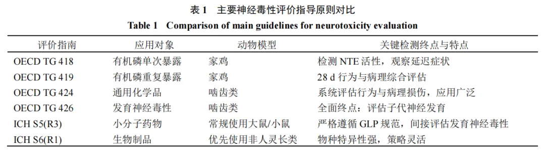 药物神经毒性评价的实验方法与化合物相同,但在一些方面有特殊要求。药物评价需严格遵循药物非临床研究质量管理规范(GLP),并符合ICH相关指南。ICH S5(R3)中提到评估后代的神经功能缺陷,虽不是独立的神经毒性检测,但以整体发育结局为评估重点,是涉及神经系统发育的间接评估[8]。针对生物药的ICH S6(R1)明确在研究药物潜在的不良药理活性时,需在适当动物模型中评估对主要生理系统(包括中枢神经系统)的功能影响[9]。生物制品由于其相对分子质量大、作用机制独特,需结合药物机制、物种特性及临床需求进行“个案分析”[16]。