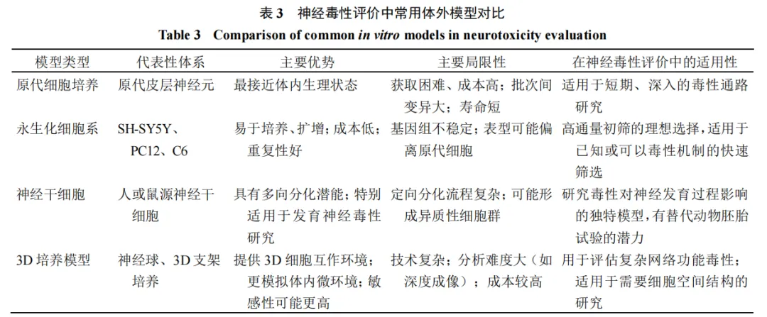 在培养方式上,3D培养技术(如神经球、支架培养)通过模拟细胞间的三维空间互作,能更真实地反映体内微环境,对神经网络功能影响药物(如抗癫痫药)具有更高的检测敏感性。体外模型各有优势和局限性,研究人员可根据实际的需求选择合适的模型进行毒性评价。神经毒性评价中常用体外模型对比情况见表3。