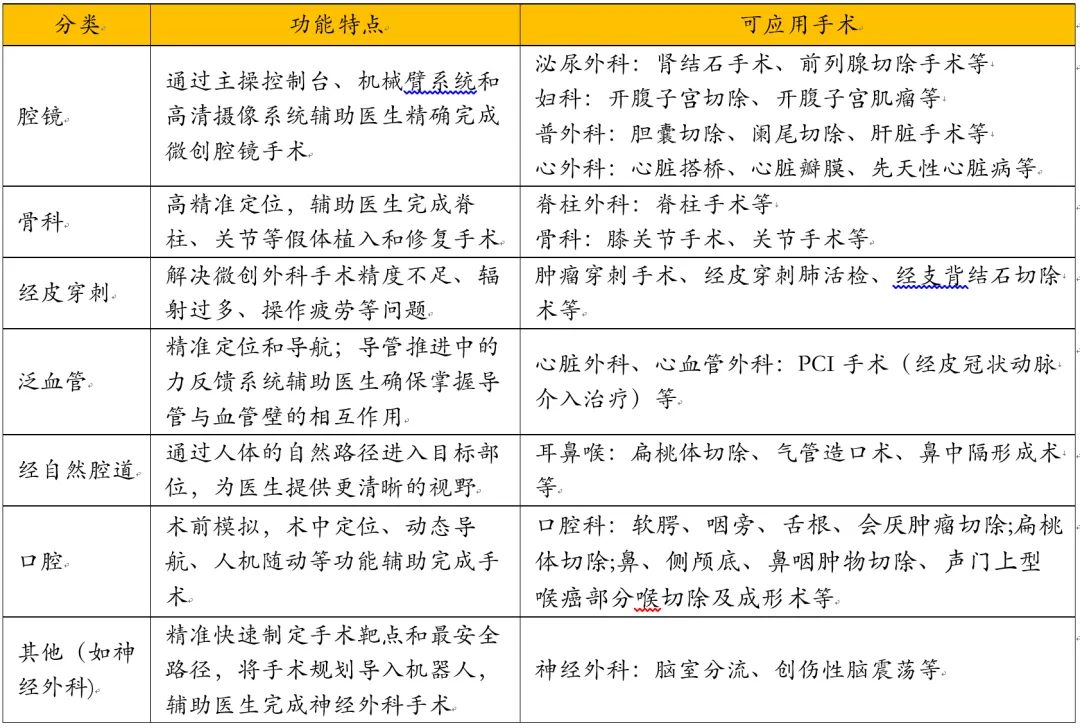 各科室适应症范围的不断拓宽进一步打开了市场空间,未来各细分外科领域有望形成接力,推动手术机器人市场持续的高增长。目前,手术机器人的适应症已经囊括多个科室的几十种适应症,其中腔镜手术机器人和骨科手术机器人的适应症最为广泛,详见下表所示: