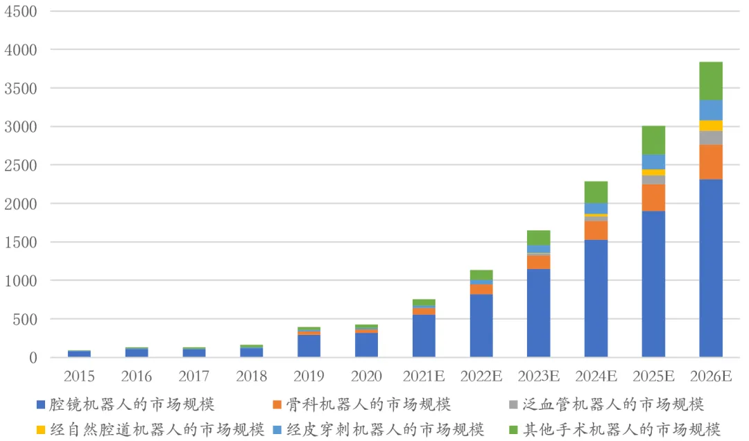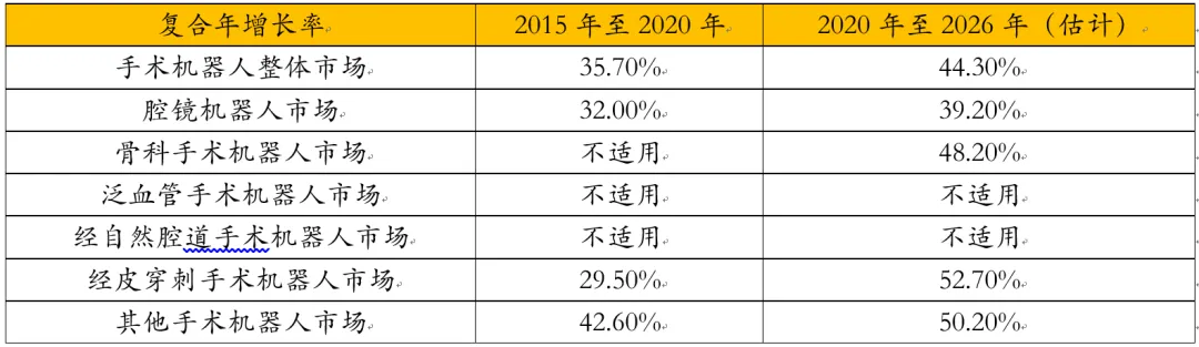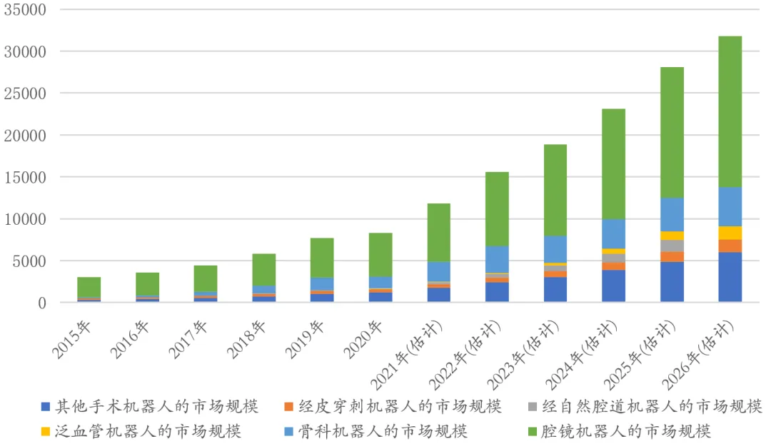 2015~2020年,全球手术机器人市场规模从30亿美元增加到83.2亿美元,复合增速22.6%,估计到2026年将达到335.9亿美元,复合增速26.2%;2020年全球腔镜手术机器人市场规模52.5亿美元,骨科手术机器人市场规模13.9亿美元,为主要的运用领域。