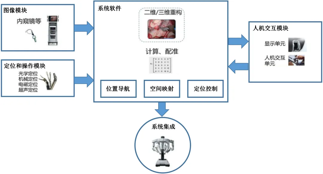 一般而言,医疗手术机器人至少应包括以下功能单元:图像采集与处理单元、定位信息获取单元、配准与空间变换单元、人机交互与显示单元、机器人定位于手术操作单元。其中前两个单元是系统的原始信息收入部分,经配准与空间变换单元进行计算后,通过人机交互进行手术规划并显示,最终由机器人实现系统输出。