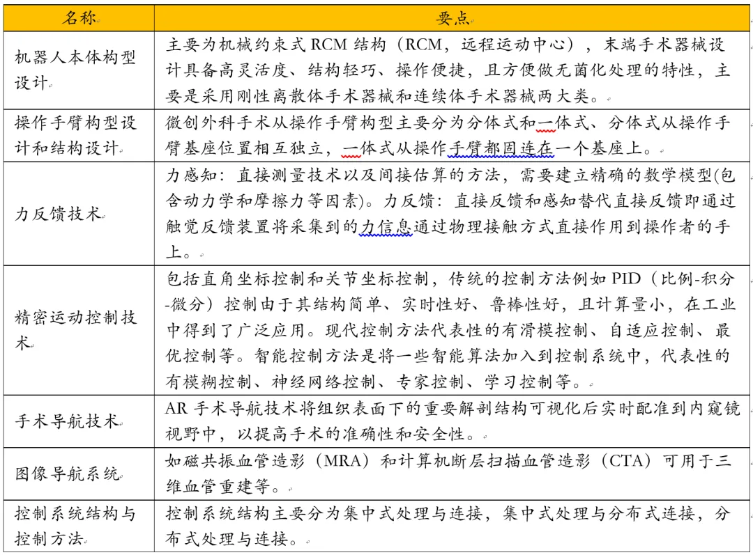 手术机器人融合了机器人学、机构学、机械学、生物力学、医学、智能材料、计算机视觉等多种学科。考虑到微创外科手术机器人设计过程中的复杂度、精确性和安全性,众多技术被使用到手术机器人的设计制当中,其中力反馈技术、精密运动控制技术、控制系统结构与控制方法是影响手术机器人性能的关键技术。这些技术的应用使得微创手术机器人系统具有比传统手术具有精度高、灵活性好、操作直观性好、安全性高等优势。