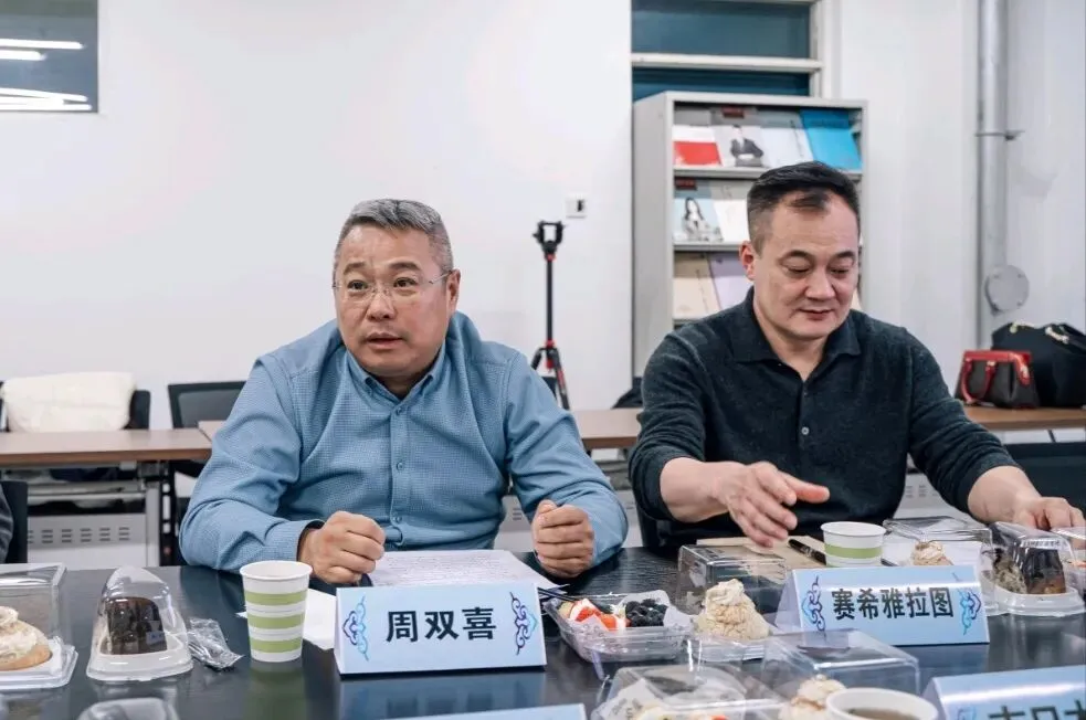 会议由团队成员、商学院副院长赛希雅拉图主持。团队负责人、商学院党总支书记周双喜首先全面介绍了团队建设概况及整体研究布局。据介绍,该团队确立三年建设期核心规划,创新构建“校内研究筑基 + 企业开发赋能 + 医院转化落地”三位一体协同共建模式。团队核心成员以商学院数字经济教研室专业教师为主体,同时吸纳呼和浩特市中医蒙医医院、硕得科技公司等单位科研骨干加入,致力于打造一支跨领域、跨学科、跨专业的复合型研究梯队。