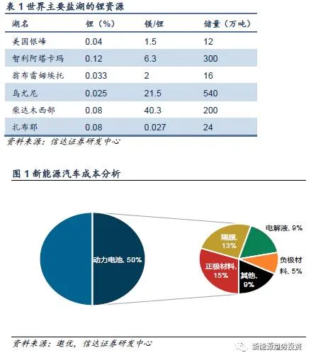 锂资源方面:青海具有全国最丰富的锂资源,占世界锂资源的1/3,全国锂资源的80%以上,主要集中在包括柴达木盆地一带,主要以盐湖资源形式存在。但是由于盐湖中镁含量高,开采难度相对较大。目前新能源汽车的成本中有30%~50%是来自动力电池,而动力电池中有近30%是正极材料,25%是隔膜。盐湖卤水法提取锂的成本最低,在1~2万元/吨,矿石法在3~4万元/吨,因此锂的合理价格在5万元左右,由于碳酸锂价格暴涨使得正极材料成本占比进一步上升,令NMC材料占整个电池成本比例的50%左右(我们认为这是在少数高端电池中三元材料的占比)。
