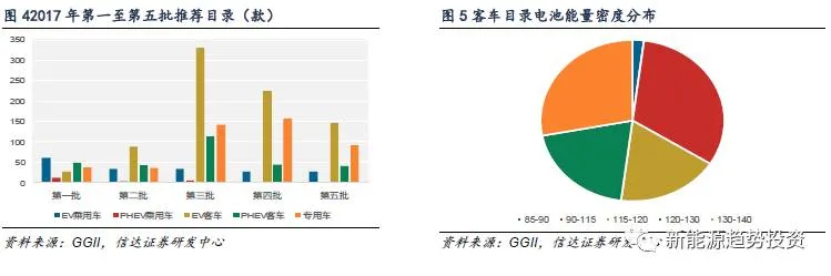 物流车有望爆发,高能量密度电池在客车中占比更高。2017年1-5批《新能源汽车推广应用推荐车型目录》总共有1763款车型,其中EV客车有815款,PHEV客车有285款,车型主要集中在客车。同时专用车进入目录,从数量上看已经超过2016年的总量,同时随着四通一达的物流车电动化,下半年物流车有望爆发,GGII预计到2020年全国纯电动物流车产量可达到18.9万辆。
