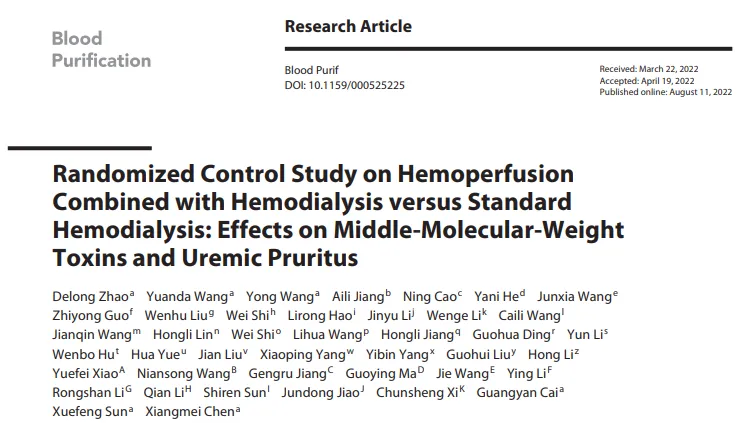 [2]Zhao Delong, Wang Yuanda, Wang Yong, et al. Randomized Control Study on Hemoperfusion Combined with Hemodialysis versus Standard Hemodialysis: Effects on Middle-Molecular-Weight Toxins and Uremic Pruritus[J]. BLOOD PURIFICATION,2022,51(10):812-822.