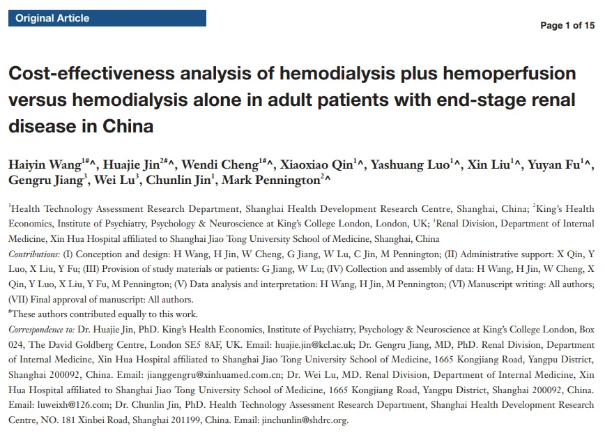 [5]Wang H, Jin H, Cheng W, et al. Cost-effectiveness analysis of hemodialysis plus hemoperfusion versus hemodialysis alone in adult patients with end-stage renal disease in China[J]. Annals of translational medicine, 9(14):1133[2023-08-10].DOI:10.21037/atm-21-1100.