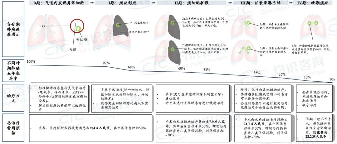 然而,在中国,癌症基本概念和肿瘤早期检测知识的普及程度不足。根据柳叶刀发布的一项涵盖23个医院的多中心研究,在中国,确诊时分期为Ⅰ期癌症的人群占整体癌症确诊人群的19.9%,而在美国此数据为35.5%,我国肿瘤早期检测率较发达国家有一定差距②。同时,肿瘤早期检测可以降低治疗成本,减轻个人和国家医疗负担。肿瘤早期时通常仅影响局部,通过微创手术即可实现病灶根除,治愈率高,治疗费用也相对较低。中晚期癌症由于发生扩散甚至转移,已经失去了根本性治疗的机会,多采用化疗、放疗或靶向药物、免疫抑制剂等新型疗法,住院周期与护理周期大大延长,即使花费巨大也只能有限延长患者生存期、几乎无法实现治愈。2021年中国肺癌发病人群约97.8万人,是中国第一大癌症,早期常无明显特征,超60%的患者在临床检出时已经是晚期,肺癌防控刻不容缓。肺癌是全球及中国癌症的主要构成,其发病人数位列全球癌症发病人群第二位、中国癌症人群第一位,2021年,全球肺癌发病人数达到226.9万,中国肺癌发病人数达到97.8万,分别占同年全球及中国总癌症新发病例的11.5%和20.6%。在这其中,中国肺癌新发病人占全球肺癌新发病人的比例达由2016年的42.5%,上升至2021年的43.1%,并呈现继续上升的趋势,预计至2030年,中国肺癌新发病例占全球的比例将达到44.5%。早期的气道异常细胞到晚期肿瘤细胞扩散,肺癌各期五年生存率不断下降。早期肺癌通常无明显特征,到了晚期会出现多种症状,如皮肤增厚及色素沉着、horner综合征、皮肌炎、骨关节增生、小脑皮质病变等。在中国,超过60%的肺癌患者临床确诊时已是晚期,而III期肺癌患者的五年生存率不足36%,IV期肺癌患者5年生存率低至6%,远远低于早期肺癌患者约60%~90%的五年生存率。早期肺癌标准治疗可行手术切除,而晚期只能寻求全身系统性治疗。具体肺癌各分期进展特征、五年生存率、治疗方式及费用预估2
