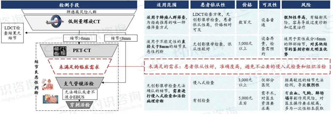 如LDCT检出结节,需应用PET-CT、病理活检等手段来确认结节的良恶性,并且辅助肺癌的诊断。但PET-CT检测主要适用于>8mm的肺结节,而侵入式病理检查的依从性较低,许多患者对侵入式及有创检查有犹豫和恐惧心理,导致“延误诊断”或“过度诊断”。肺结节良恶性判断可以采取手术活检或非手术活检,但是仍有一定风险。肺结节非手术活检主要包括:1)常规气管镜检查,其中包括气管镜直视下刷检、活检或透视下经支气管镜活检(Transbronchial lung biopsy,TBLB),超声引导下的TBLB称为EBUS-TBLB,较传统TBLB更精确;2)经胸壁肺穿刺活检(transthoracic neddle biopsy,TTNB),可在CT或超声引导下进行,对周围型肺癌诊断的敏感度和特异度较高。肺结节手术活检主要包括:1)胸腔镜检查,适用于无法进行非手术活检取得病理标本的肺结节,常用的方式有视频辅助胸外科活检(VATS)等。2)纵膈镜检查,是确诊肺癌和评估淋巴结分期的有效方法,针对纵膈淋巴结状况判断的金标准,但操作创伤及风险相对较大。此前,在无创影像学筛查和有创侵入式诊断之间,缺乏一层便捷高效、非侵入式的早诊手段,用以先一步鉴别肺结节阳性的良恶性状态,使良性肺结节患者免于不必要的有创侵入性检查以及病理活检。在肺癌早筛早诊的流程中,缺乏基础评估手段的中间桥梁,亟待更准确、患者依从性更高、风险更低检测手段进行结节评估。4